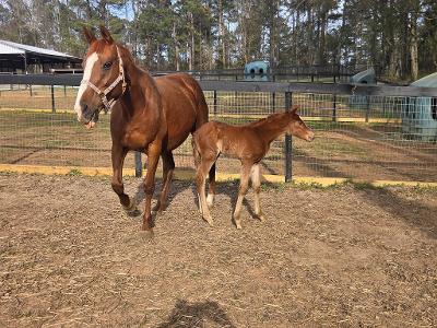 SaddleCreek has a new little filly “Honey Whiskey”. Mama, “Cat Will Get Even” are both doing very well! Isn’t our Honey Whiskey so darling! Little Miss Honey Whiskey & Mama, will be back at the ranch soon. We can hardly wait!